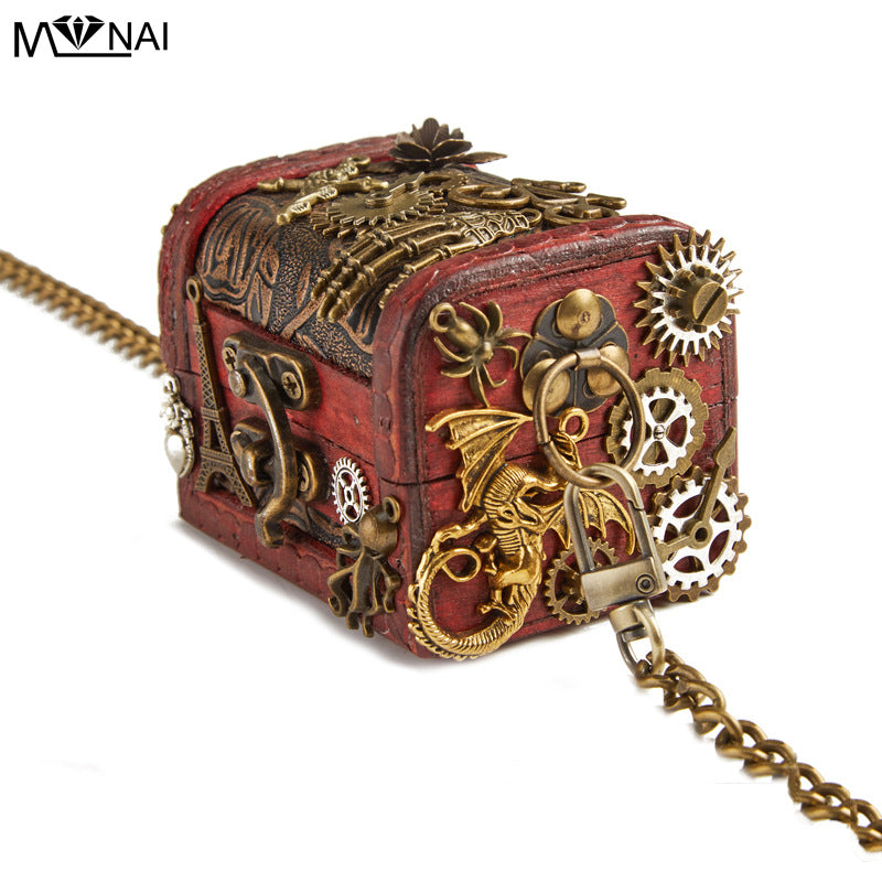 Gothic retro mini creative personality small bag steampunk wooden treasure box metal chain oblique trend mini bag